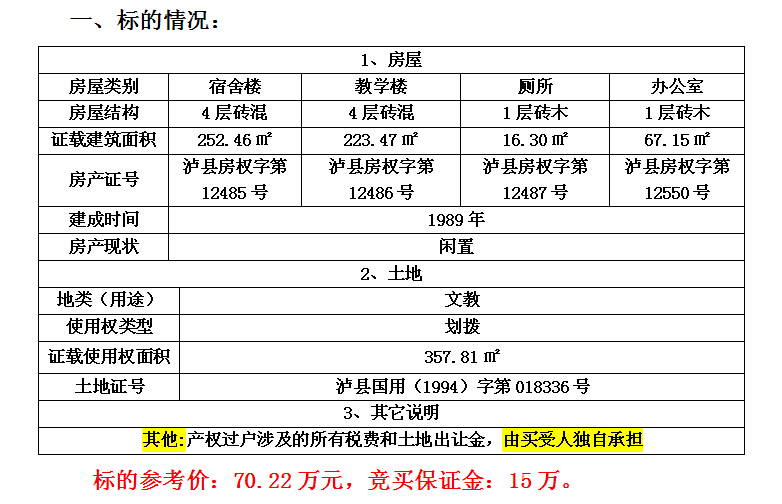 受瀘縣喻寺鎮(zhèn)人民政府委托,我公司將于2016年1月20日上午10時(shí)在瀘縣公共資源交易中心拍賣(mài)大廳公開(kāi)拍賣(mài)瀘縣喻寺鎮(zhèn)廣東街(原喻寺鎮(zhèn)中心幼兒園)的房產(chǎn):